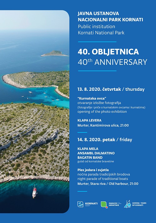 JU NP Kornati obilježava svoju 40-tu godišnjicu. Za 13. i 14. kolovoza predviđen je program koji će započeti otvaranjem izložbe fotografija “Kurnatska ovca”, zabavnim programom koji će kroz dva dana uključiti i degustaciju gulaša od kornatske bravetine i završiti noćnom paradom tradicijskih brodova.